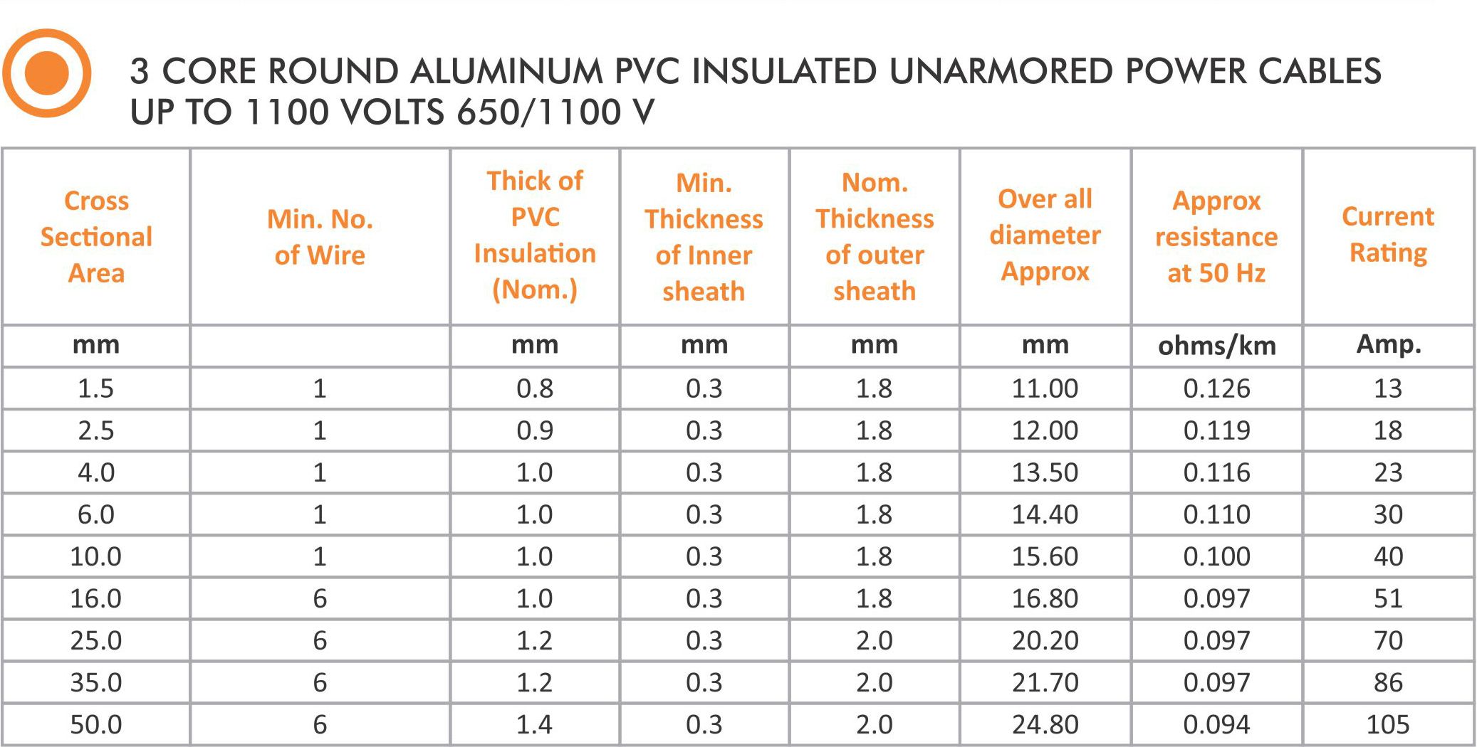 3 core round Aluminium PVC insulated unarmored power cables up to 1100 Volts as per IS : 650/1100V.